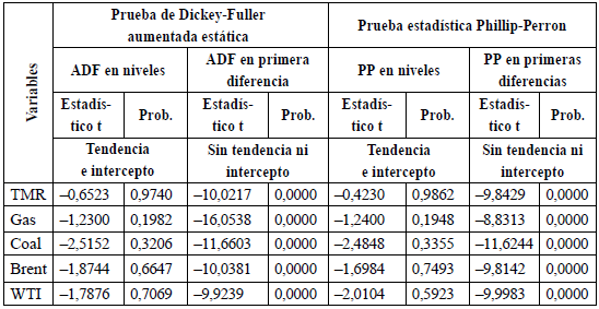 En principio, para estimar un VAR generalizado con variables cointegradas, las series utilizadas deben cumplir con la relación de cointegración, es decir, si las series tienen movimientos conjuntos, se crean combinaciones lineales de ellas, lo que da lugar a residuales estacionarios. Ello indica que el comportamiento de las series presenta patrones de conducta relacionados que impiden su libre movimiento. De esta manera, la dinámica de las series está enlazada en el largo plazo, donde converge a un estado de equilibrio (Engle y Granger, 1987). Entonces, con el fin de identificar el nivel de integración de las series, se realizan las pruebas de raíz unitarias de Augmented Dickey-Fuller Test Static y Phillip-Perron Test Statistic, cuya hipótesis nula plantea la existencia de raíz unitaria, lo que explica que las variables son integradas de orden 1, por lo que no son estacionarias.