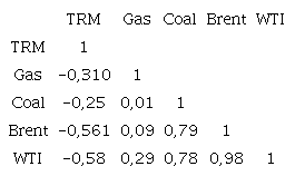 Los resultados permiten inferir, a partir del análisis de cointegración, que los precios de las commodities están cointegrados entre sí y están relacionados con la dinámica de la TRM. En la misma línea, se observó que, ante un impulso positivo en los precios, las commodities reaccionan positiva y significativamente entre ellas, a excepción de la respuesta del gas al carbón.