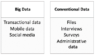 Big data is the term widely used to describe vast amounts of information and variables and can be understood as 'high-volume, high-velocity and/or high-variety information assets that demand cost-effective forms of information processing that enable enhanced insight, decision-making, and process automation' (Gartner as cited in Karlsson et al., 2019, paragraph 10). Also, the World Bank presents big data as 'the term used to describe constantly increasing flows of data emitted from connected individuals and things, as well as a new generation of approaches being used to deliver insight and value from these data flows' (The World Bank, 2016, p.72). Big data may also refer to the identification of technological challenges due to the generation of data, its volume and velocity as well as a variety of outtake traditional systems (Laney, 2001, as cited in CONPES, 2018, p.27).