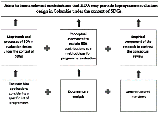 Specific public programmes are presented as a way of illustration to frame the contributions that BDA may provide to programme evaluation design in Colombia. This exercise also intends to map specific and relevant trends of BDA applications in evaluation design under the context of SDGs. A qualitative analysis allows this research to establish a conceptual assessment in the explanation of BDA contributions. The goal here is to build upon concepts that rapid technological improvements of BDA as an emerging phenomenon have brought to public policy evaluation processes as a research topic. The process presents a literature review in a documentary analysis to provide researchers new ideas regarding relevant applications of BDA to conduct meaningful policy analyses. This review relied mainly on scientific articles and publications on topics closely related to BDA, programme evaluation and management. The literature on big data analysed here provided quite useful definitions and clear explanations of current trends and applicability to programme evaluation designs.