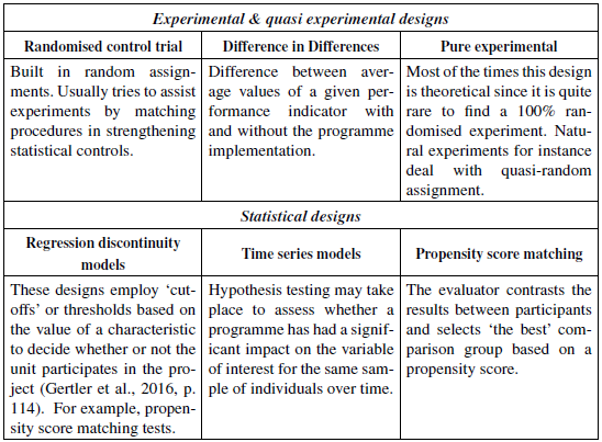 The literature concerning impact evaluation defines several types of evaluation that can be identified as follows: I. policy and programme evaluation, II. formative evaluation, III. developmental evaluation, IV. summative evaluation (Bamberger, 2016). Nevertheless, and based on the aim of this article, the focus here is on the latter category which is centred mostly in causality (Bamberger et al., 2016) and where two types of evaluation design are normally considered: experimental and predictive analytics.
