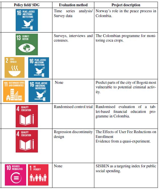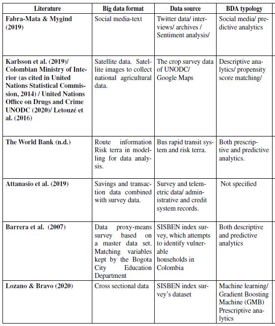 Colombia is a country that provides multiple examples of pilot programmes that have incorporated BDA to design evaluation models for SDGs related projects. In examining these programmes several conditions were considered: first, only verifiable publications mostly from public institutions, official documents and projects supported by the Colombian Government were selected. Second, the aim, policy field, origin of data and BDA typology adopted were also considered in the classification phase. The review evidenced that descriptive and predictive designs, as well as propensity score matching were employed in these attempts. Annex 1 displays an overview of the studies analysed in the literature review to inform the reader with respect to this exercise. The BDA typologies employed here are the ones described in section 'The advent of big data analytics (BDA) as an alternative'.