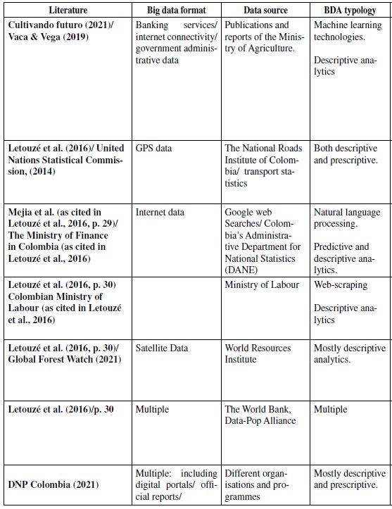 Moreover, Karlsson et al. (2019) present an overview of how BDA has been used as an innovative solution for problems faced by most Latin American countries, regarding programme design, implementation and evaluation. Colombia became the eighth country worldwide and the first in Latin America in establishing a policy to enable conditions for the adoption of BDA in the public sector (Escobar Gutiérrez et al., 2021, p. 28).