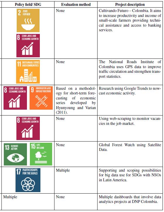 This document incorporates an empirical overview of the adoption of the big data initiative in Colombia, which was selected as a case study since it is a country leading this sort of initiatives in the region, including those for programme evaluation purposes within the framework of the UN 2030 Agenda for Sustainable Development. The Colombian context is also a good example to get an idea on how government institutions still lack proper mechanisms for collecting and analysing data with the aim of monitoring sustainable development goals (SDGs).