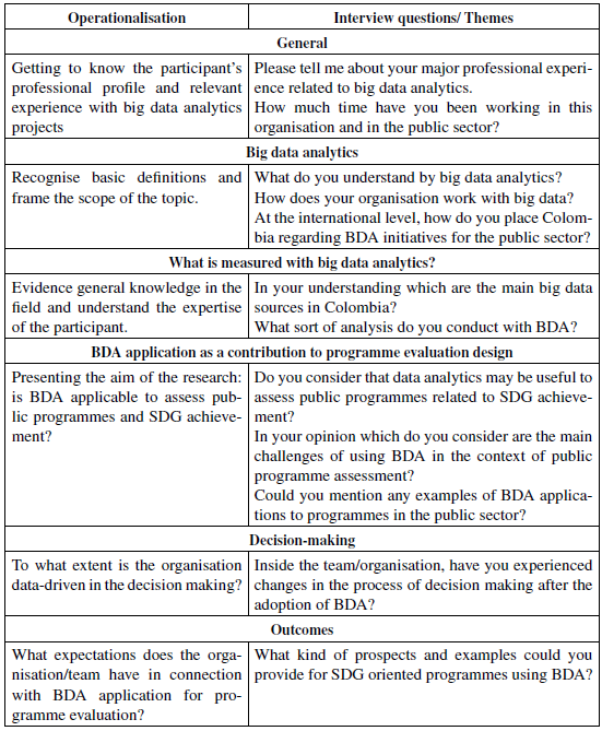 Six interviews were conducted for the data collection strategy of this research, all of them with experts in data analytics and public policy from institutions such as DNP3. The aim of this process was to reveal applications of BDA that are relevant and realistic to programme evaluation with potential for monitoring SDGs. At the operational level open ended questions guided the conversation to promote a richer discussion. Codifying the themes of the interviews with topic questions4 was the way to evidence extreme points of view in the spectrum of answers provided by the participants. The method to document the results relied on broad descriptions that use anonymised extended verbatim extracts and pattern analysis typically considered in qualitative research (Jensen & Laurie, 2016, p. 279).