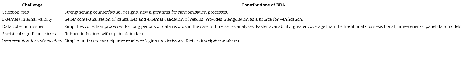 The exponential digitalisation has made data-driven policymaking a popular trend among social scientists, particularly statisticians, economists and public managers. Big data becomes especially attractive because of the features described above, but particularly because of real-time and high velocity information that offers the opportunity to have more continuous evaluation processes (Olsson & Bull-Berg, 2015). There are several forms in which big data analytics can modernise programme evaluation design: by strengthening conventional models, enhancing indicators and integrating larger amounts of data never considered by traditional techniques (Bamberger, 2016). One cannot deny that there is a huge trend in social sciences for evidence-based approaches and BDA can be considered as one of those experiments that policymakers are still testing (Poel et al., 2018), and who seek to overcome situations such as biased estimations or wrong impressions of programme performance.