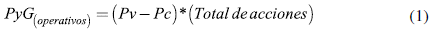 El estudio compara el resultado del ejercicio (PyG)8 derivado de la aplicación de las reglas técnicas en comparación con la rentabilidad alcanzada por la estrategia de comprar y mantener el activo en el periodo de estudio. Trabajos similares, como los de Lento (2008) y Coe y Laosethakul (2010), desarrollaron este tipo de análisis. Su cálculo se determinó a partir de la cotización presentada por el activo al momento de su venta (Pv) y su compra (Pc), calculando la diferencia entre estos dos precios multiplicada por el número de acciones transadas, así: