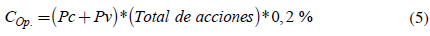 La ecuación (5) representa el cálculo del costo de la operación, donde la sumato-ria de los precios de compra y venta, multiplicada por el número de activos, proporciona la base de liquidación, sobre la cual se calcula el 0,2 % de los costos de operación, así: