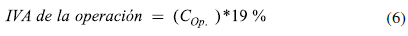 El costo de operación (Cop.) resultado de aplicar la ecuación (5) se constituye en la base gravable para el cálculo del 19 % correspondiente al IVA de la operación.