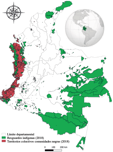 Hasta el 2018, en el país se contaban 187 territorios colectivos de comunidades negras constituidos en 9 departamentos, que abarcaban un área total de 5 679 617 ha (Figura 1).
