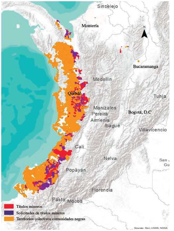 En el caso de los traslapes de la titulación minera con territorios colectivos de comunidades negras, se encuentra que en la actualidad existen 339 títulos mineros yuxtapuestos. El área que abarcan estos títulos asciende a 413 125 ha, las cuales se hallan dispersas en 49 municipios de la región Pacífica. Los municipios con mayor incidencia de la minería sobre territorios de comunidades negras son López de Micay (Cauca), Quibdó (Chocó), Guapi (Cauca) y Buenaventura (Valle del Cauca), que suman el 58 % del total de los traslapes (Tabla 1, Figura 3).