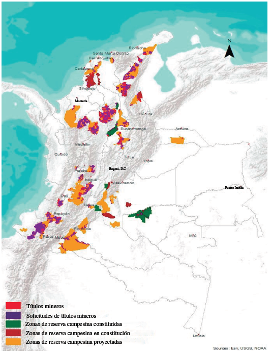 Para revelar los conflictos de la actividad minera con los territorios colectivos de comunidad étnicas y las zonas de reserva campesinas, se consideró la yuxtaposición de las áreas correspondientes a estos territorios, localizados en gran medida en los márgenes de la frontera agraria, y los polígonos que definen los títulos mineros vigentes y las solicitudes en trámite ante la ANM.