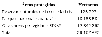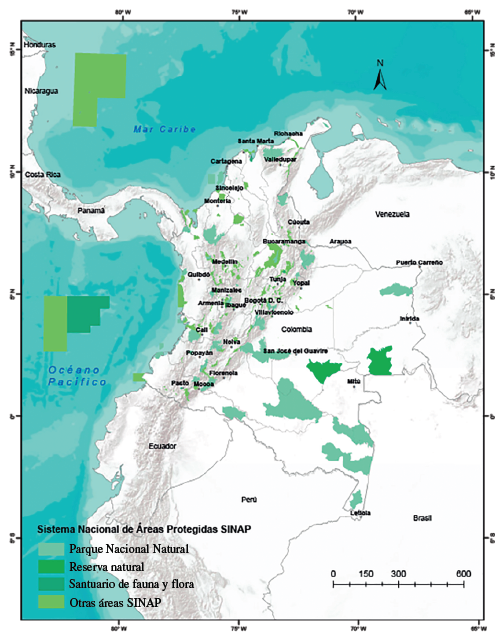 Actualmente existen 29 millones de áreas protegidas que forman parte del SINAP: el 56 % corresponden a las áreas del Sistema de Parques Nacionales Naturales (PNN); el 44 %, a las otras áreas del SINAP de propiedad pública (reservas forestales protectoras, parques naturales regionales, distritos de manejo integrado, áreas de recreación y distritos de conservación de suelos); y el 0,44 %, a las reservas naturales de la sociedad civil. La Tabla 4 ilustra el número de hectáreas por diferentes áreas. Estas áreas se localizan principalmente en el sur del país hacia la llanura oriental y la selva amazónica, en el borde occidental del océano Pacífico colombiano, en las cordilleras y en la Sierra Nevada de Santa Marta en el norte del país (Figura 5).