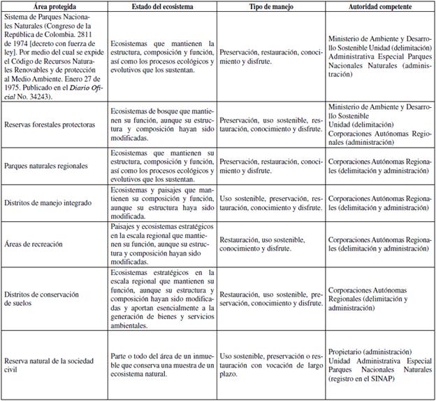 En Colombia, las áreas protegidas se dividen en públicas y privadas. Las áreas protegidas públicas son: a) las del Sistema de Parques Nacionales Naturales (PNN); b) las reservas forestales protectoras (nacionales y regionales); c) los parques naturales regionales; d) los distritos de manejo integrado (nacionales y regionales); e) los distritos de conservación de suelos (regionales); y f) las áreas de recreación (regionales). Las diferencias entre áreas radican en las combinaciones entre el estado de la función, estructura y composición del ecosistema; los servicios ecosistémicos que ofrece; y el tipo de manejo que se establece para cada uno. Por su parte, solo existe una categoría de área protegida privada, denominada reserva natural de la sociedad civil (PNN, 2015). La Tabla 3 describe las características de cada una de las áreas protegidas del Sistema Nacional de Áreas Protegidas (SINAP).