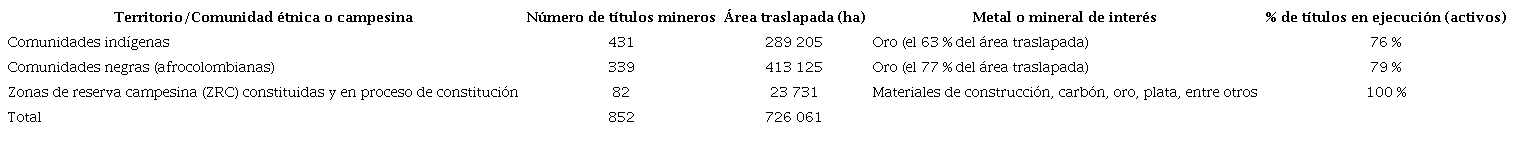 La multinacional Anglogold Ashanti Colombia S. A. y la empresa Exploraciones Chocó Colombia S. A. S. son detentoras del 30 % de los títulos (101 en total) que se traslapan con estos territorios ancestrales de comunidades afrocolombianas. El área que cubren los títulos mineros otorgados a estas dos empresas alcanza 73 940 ha. Ahora bien, cerca de la mitad de estos títulos (46) se encuentran suspendidos por la autoridad minera.