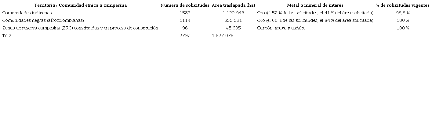 Al igual que las solicitudes que se traslapan con resguardos indígenas, las solicitudes que cubren territorios colectivos de comunidades afrocolombianas tienen como interés la extracción de oro (el 60 % del total de las solicitudes). Las empresas que han solicitado áreas considerables son Continental Gold Limited Sucursal Colombia S. A. y Anglogold Ashanti. En total, estas empresas conjuntamente concentraban 136 736 ha en solicitudes de titulación minera que se traslaparon con territorios colectivos (datos hasta 2018) (Tabla 2, Figura 3).
