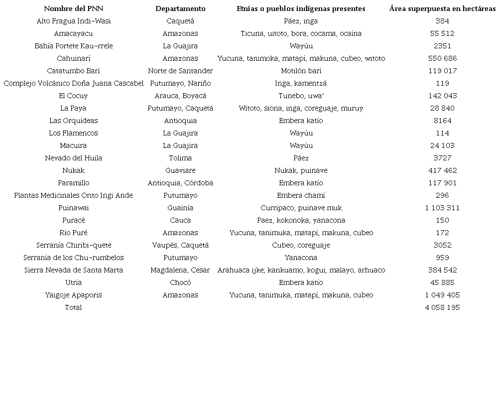 Muchos resguardos indígenas constituidos se encuentran en las áreas del Sistema de Parques Nacionales Naturales, pues el 25 % de estas áreas se traslapan con 74 resguardos indígenas ubicados en 23 parques diferentes. La Tabla 5 muestra las áreas de superposición de resguardos indígenas en el Sistema de Parques Nacionales Naturales.