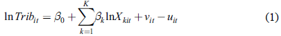 En la ecuación (1), ln representa los logaritmos naturales de las variables del modelo; Tribit corresponde a la recaudación tributaria para la unidad i en el año t; β0 es una constante para todas las secciones cruzadas (e. g., municipios); Xkit representa cada una de las K variables que contribuyen a explicar la dinámica de la recaudación para la dupla it (i. e., determinantes de la carga tributaria); y βk, con k E [1, K], corresponde a los coeficientes que junto con ß0 se deben estimar. Además, vit es el usual término de error (i. e., no es controlable por la administración tributaria y se asume independiente e idénticamente distribuido como N(0,σiv); y uit representa el monto de recaudación que se pierde por factores que son controlables4 (e. g., debido a la falta de fiscalización).