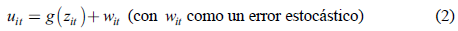 Dicho modelo permite estimar la frontera estocástica tomando un término de ineficiencia variable en el tiempo de manera simultánea con una ecuación que incorpora la dinámica de uit a partir de un conjunto de factores zit (ecuación 2). Además, se sugiere la aplicación de este modelo porque permite incluir la heterogeneidad persistente en la ineficiencia técnica como un elemento estocástico propio para cada unidad de análisis i, lo que contribuye a controlar por sesgos asociados a la omisión de variables (Zárate-Marco y Vallés-Giménez, 2019).