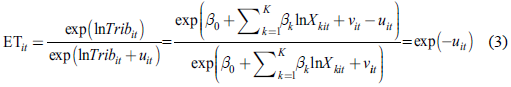 Bajo las premisas que se presentaron previamente, el esfuerzo tributario se puede estimar como la exponencial del negativo de la ineficiencia técnica (-uit). Este valor es una ratio entre la recaudación efectiva y la capacidad tributaria, la cual se puede calcular descontando el efecto de la ineficiencia técnica. Por lo tanto, si se tienen en cuenta la estructura logarítmica de la ecuación (1) y el desarrollo que se presenta en la ecuación (3), se llega a: