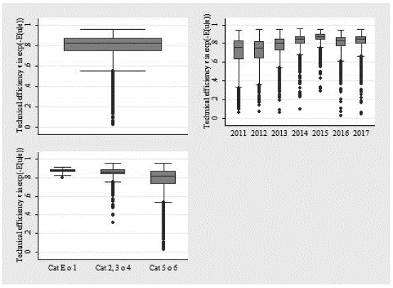 Al respecto, la Figura 1 presenta un diagrama de caja que sintetiza su distribución alrededor de la mediana por año y por categoría de los municipios (Congreso de Colombia, 6 de octubre de 2000). Además, se ha optado por el esfuerzo tributario calculado cuando en la estimación de la frontera estocástica se incluyen simultáneamente los potenciales determinantes de la ineficiencia técnica, pues ello permite diferenciar entre la recaudación que se cede por la aplicación de beneficios tributarios y lo que corresponde a la ineficiencia de la administración tributaria. Sin embargo, el ordenamiento (ranking) de los municipios con base en su esfuerzo tributario no varía de manera significativa entre lo que se obtiene utilizando el modelo TRE_1 o el TRE_2 (Tabla 2); el índice de correlación de Spearman para las dos alternativas es de 0,947.