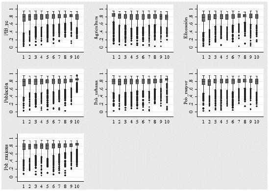 Como se evidencia en la Figura 2, las medianas del esfuerzo tributario por deciles crecen, por lo general, cuando las variables que se usan para realizar la distribución se asocian positivamente con el nivel de recaudación (Tabla 1), pero la tendencia es negativa cuando esa distribución se hace con base en la participación del sector agrícola en el PIB. Asimismo, los municipios con mayor capacidad económica, tamaño de población y mayores proporciones de población urbana y femenina son los que se asemejan más entre sí con respecto a su esfuerzo tributario.