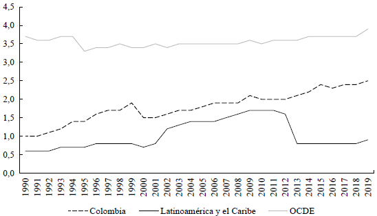 De hecho, la Figura 4 brinda elementos para explicar parte de los resultados aquí presentados. En dicha figura se evidencia que la recaudación de los gobiernos locales en Colombia ha crecido de manera sostenida desde 1990, que ha cerrado la brecha con los países de la OCDE y la ha aumentado con respecto a América Latina y el Caribe. Esto se podría deber, en buena parte, al avance del proceso de descentralización en Colombia entre finales de los años ochenta y los noventa del pasado siglo en sus ámbitos político, fiscal y administrativo (en lo normativo se sugiere consultar Congreso de Colombia, 30 de diciembre de 1986, 12 de agosto de 1993, 8 de febrero de 1994; Constitución Política de Colombia, 1991). En síntesis, la Figura 4 muestra que la recaudación de los municipios colombianos en su conjunto creció en un 150 % entre 1990 y 2019.