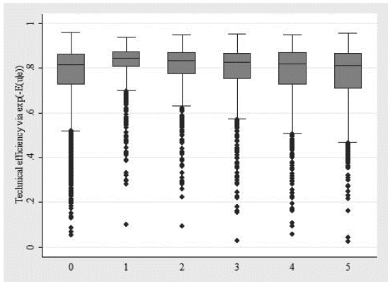 Con base en el segundo modelo de la Tabla 2 también se observa que, de las variables que podrían incidir en la ineficiencia técnica, los ingresos recibidos por transferencias y regalías8 y la densidad poblacional se asocian de manera negativa con el término uit de la ecuación (1) y son estadísticamente significativas. Así, la inefi-ciencia técnica se reduce en la medida que los ingresos por transferencias y regalías del municipio se incrementan o su densidad poblacional genera economías de escala. Si bien los ingresos no tributarios se acompañan de un riesgo de pereza fiscal, en el caso colombiano su uso está dirigido a sectores con externalidades positivas (e. g., educación y salud).