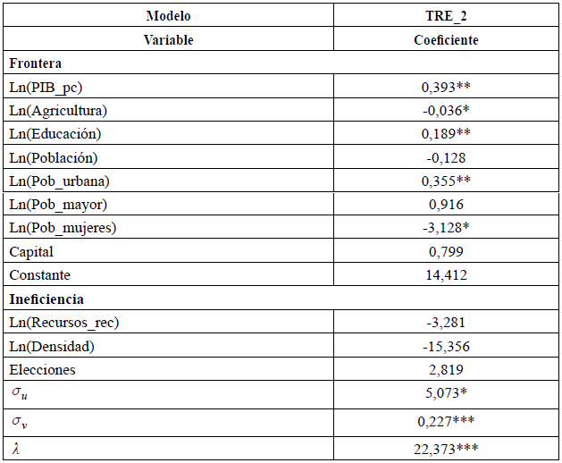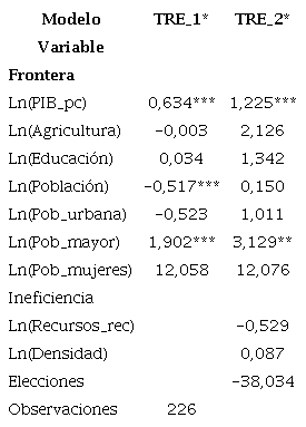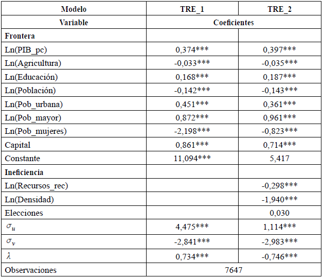 La Tabla 2 presenta las estimaciones de la frontera estocástica luego de emplear el modelo TRE de Greene (2005) bajo dos escenarios: uno en el que se asume que la ineficiencia técnica se comporta como un ruido blanco y otro en el que se estudia su dinámica a partir de tres variables que contextualizan las condiciones de operación de las administraciones tributarias (i'. e., Recursos rec, Densidad y Elecciones). Así, se plantean dos modelos TRE, uno con y otro sin determinantes de la ineficiencia técnica.