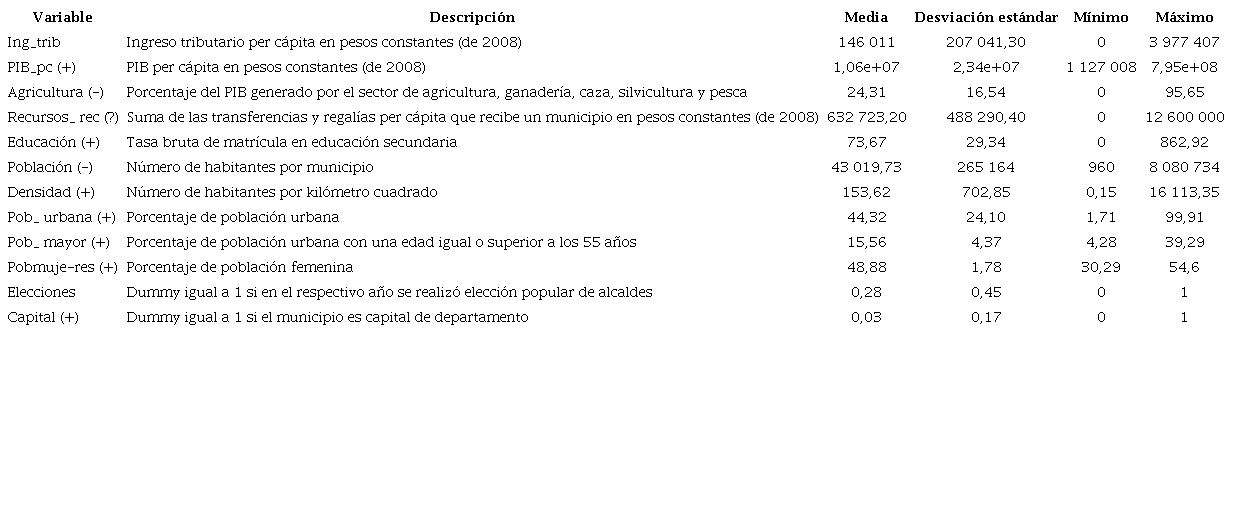 Así, la Tabla 1 presenta el subconjunto de variables disponibles para este trabajo, además de los signos esperados de sus correlaciones con el nivel de recaudación (entre paréntesis)5, su descripción y algunas estadísticas básicas.