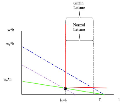 Consider now the theoretically possible, but extreme and unlikely case of Leontief preferences, between leisure and the consumption of all other goods.