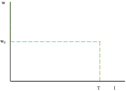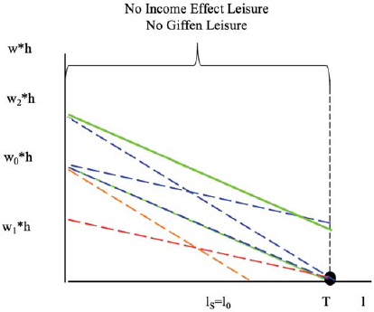 In figure 3, preferences are in green and the budget lines are dashed blue. Assume to start with, that the budget constraint and the indifference curve overlap. In this case, the optimal bundle is undetermined between 0 and T, and any change in the relative prices leads to a corner solution. The budget lines that keep the initial level of utility constant for a given change in relative prices and thus, allow to identify the substitution effects, are in red. Given a corner solution, any change in the relative prices that leads to the same corner solution -or another corner solution-, has a non-positive substitution effect, and has no income effect on the demand for leisure.