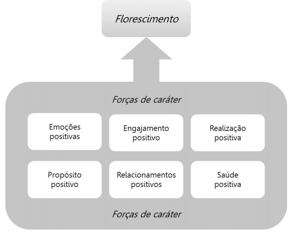 Assim sendo, o florescimento inclui, fundamentalmente, os seguintes domínios: emoções positivas (alegria, gratidão), engajamento positivo (interesse, curiosidade), realização positiva (buscar e alcançar resultados significativos), propósito positivo (contribuir com a comunidade, ajudar outras pessoas) e relações positivas (habilidades sociais e emocionais) (ver Modelo PERMA, Seligman, 2011). Estes domínios e demais aspectos do florescimento (como resiliência, otimismo, flow) são alcançados de forma mais efetiva se sustentados pelo desenvolvimento das forças pessoais (i.e., forças de caráter dominantes em uma pessoa, ver Peterson & Seligman, 2004) (Norrish & cols., 2013). Estudos têm evidenciado que “indivíduos que estão florescendo (ou que têm um elevado nível de bem-estar psicológico), aprendem de forma eficaz, trabalham de maneira produtiva, têm melhores relações sociais, são mais propensos a contribuir com sua comunidade, e têm melhor saúde e expectativa de vida” (Huppert & So, 2009, p. 1).