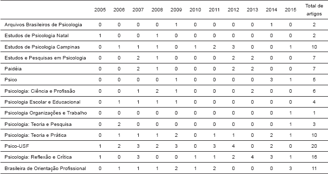 Nessa etapa foram analisados os seguintes periódicos: Arquivos Brasileiros de Psicologia (não há informações em seu site sobre a periodicidade de sua publicação), Estudos de Psicologia - Natal (publicação trimestral), Estudos de Psicologia - Campinas (publicação trimestral), Estudos e Pesquisas em Psicologia (não há informações em seu site sobre a periodicidade de sua publicação), Paidéia (publicação quadrimestral), Psico (publicação trimestral), Psico-USF (não há informações em seu site sobre a periodicidade de sua publicação), Psicologia: Ciência e Profissão (publicação trimestral), Psicologia Escolar e Educacional (publicação semestral), Psicologia: Organizações e Trabalho (publicação trimestral), Psicologia: Reflexão e Crítica (publicação trimestral), Psicologia: Teoria e Pesquisa (publicação trimestral), Psicologia: Teoria e Prática (publicação quadrimestral), Psicologia USP (publicação quadrimestral), Revista Brasileira de Orientação Profissional (publicação semestral) e Temas em Psicologia (publicação trimestral).