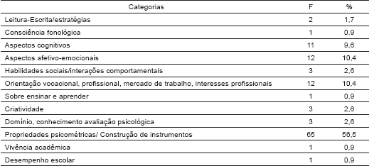 A análise da Temática revelou a quantidade e a distribuição dos artigos, considerando os temas implicados na avaliação. A Tabela 2 ilustra tal distribuição. No entanto, ressalta-se que alguns artigos trataram de duas ou mais temáticas ao mesmo tempo. Nesse sentido, todas as temáticas pesquisadas foram computadas totalizando 115 ocorrências. A análise do teste Qui-quadrado apontou que a distribuição das temáticas não era equitativa, tendo em vista [x2(5,115) = 147,07, p<0,001]. Nesse sentido, observou-se que ‘propriedades psicométricas/construção de instrumentos’ (n=65; 56,5%) foram as temáticas mais investigadas, seguidas por ‘orientação vocacional, profissional, mercado de trabalho, interesses profissionais’ (n=12; 10,4%) e ‘aspectos cognitivos’ (n=12; 10,4%).