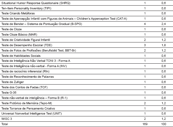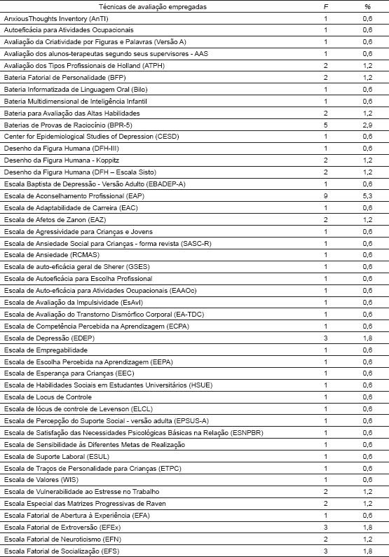 Observou-se uma grande variabilidade de técnicas empregadas nas avaliações analisadas (n=169). A técnica mais empregada foi a Escala de Aconselhamento Profissional (EAP) (n=9; 5,33%), seguida pela Self-Directed Search Career Explorer (SDS) (n=6; 3,6%), Baterias de Provas de Raciocínio (BPR-5) (n=5; 2,9%) e Teste de Bender - Sistema de Pontuação Gradual (B-SPG) (n=4; 2,4%). A lista completa de todos os instrumentos que foram utilizados nos artigos consta na Tabela 6.