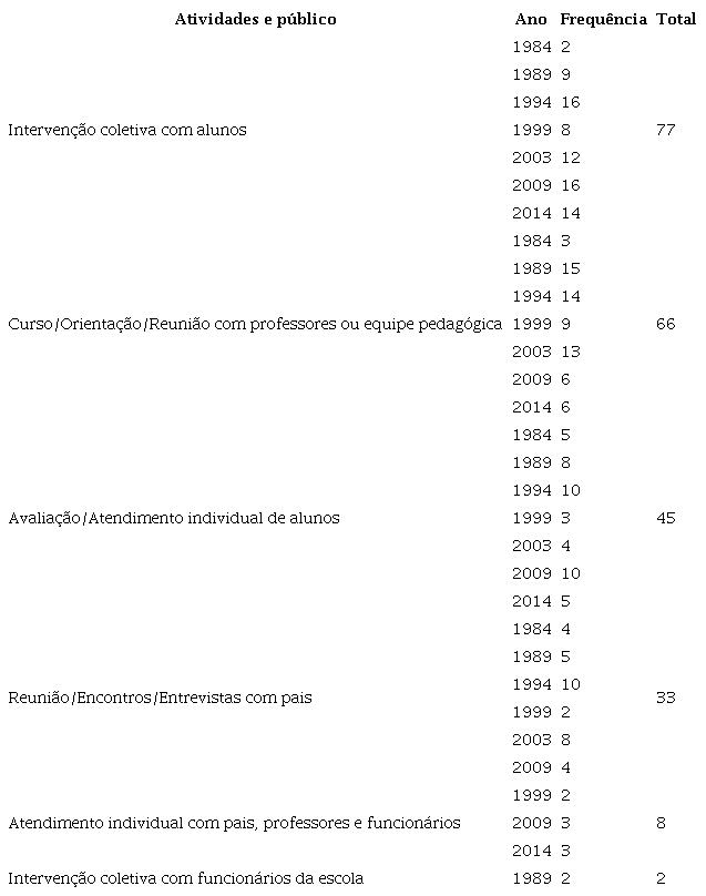 Com relação às práticas, nos relatórios, observamos que o primeiro ano, 1984, parte de um fazer pautado na avaliação e no atendimento individual, característica das primeiras intervenções do psicólogo na escola, conforme analisam Facci e Souza (2014). Em 1989, a prática principal é concernente, sobretudo, ao trabalho com os professores, o que sugere uma mudança no foco de intervenção, antes agindo diretamente com o aluno, e posteriormente auxiliando o professor a intervir com eles. No ano de 1994, a centralidade passa a ser na intervenção coletiva com os alunos, seguida ainda de perto pelo trabalho com os professores, no entanto, também se faz presente a avaliação e atendimento individuais. Tal forma de intervenção também foi localizada na pesquisa realizada por Lessa (2010).