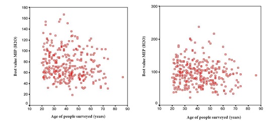Regarding MIP values and age, it was observed an inverse and significant correlation (r=- 0.161, p =0.005), which suggests that as age increases MIP values decrease. In reference to the relationship between age and the MEP, it is inverse (r= -0.096) and not statistically significant (p= 0.093). It was found that those with an age range of 20 to 39 years in both males and females, the MIP and MEP values were higher compared to those over 40 years.