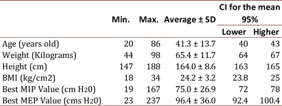 For data processing the statistical package SPSS® (Statistical Package for Social Science) version 17.0 for windows 2008 was used. For qualitative variables proportions were calculated and for quantitative variables mean, range and standard deviation were calculated. Confidence intervals were determined at 95%. The bivariate analysis assessed the relationship of independence and homogeneity of the anthropometric variables with the values of maximal respiratory pressures. They used correlation coefficients according to the measuring level of the variable and to their normal or abnormal behavior (Kolmogorov -Smirnov). The statistical differences were determined with a significance level of 95% (p ≤0.05). Additionally, homogeneity tests were carried out by using student's t-tests and Mann-Whitney U tests according to normal or abnormal behavior of the variables. For nominal variables with more than two groups, Fisher's F tests (ANOVA) and Kruskal-Wallis H were used. A multiple linear regression model from the model evaluation tests was constructed.