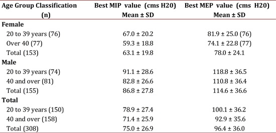 Women have lower MIP and MEP values when compared to men. Neder et al., reported MIP and MEP values of 115.3 and 125.23 cmH20 in men respectively, whereas in women values were 86.2 and 88 cmH20 respectively3. This could be due to anatomical, structural and hormonal differences.