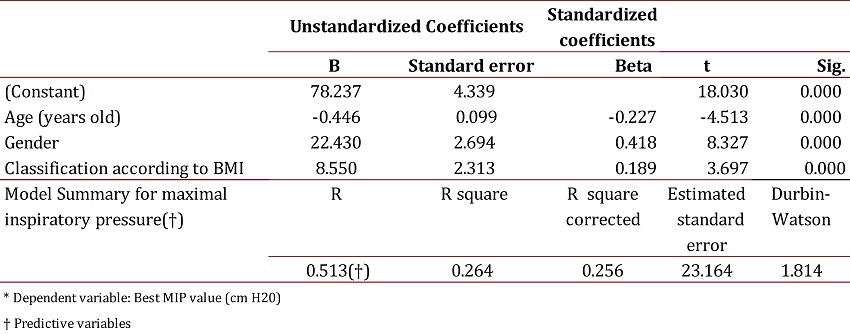A multiple linear regression model was estimated in order to predict MIP and MEP values based on variables such as age, gender The highest coefficients of determination (r2) were taken for both MIP to MEP values; and the best model was tested for normality and homoscedasticity of waste, using the Kolmogorov-Smirnov and White tests respectively, it was also verified that the errors were normally distributed (K-S), equal to 0 and to be independent (Durbin Watson near 2). Finally, a multiple regression model was proposed to predict the dependence of the values obtained for maximal respiratory pressures respect to the independent variables with better r2 by a linear combination of the parameters used and the theoretical and practical formulation of the model obtained for values of maximum inspiratory and expiratory pressure was exposed.