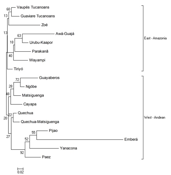The NJ tree (Fig. 2) shows two clusters East-West: the Amazonian Tukanoan populations on a branch and Guayaberos, Andean and Panamanian groups on the other.
