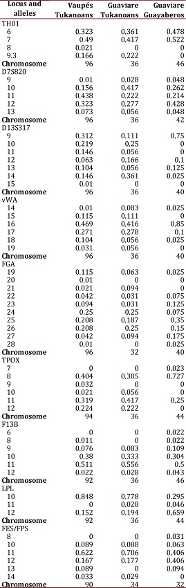 The FST estimated by AMOVA for the three groups was 0.06691 (p <0.00001). The FST estimated across all loci was 0.07477 (IC 95% 0.02897 - 0.13481). With respect to the pairwise FST (Table 3), the Guayaberos showed moderate differentiation with high significance (p <0.01) regarding the two Tukanoans groups, while the FST between the two Tukanoan populations showed no significant differentiation (p> 0.05).