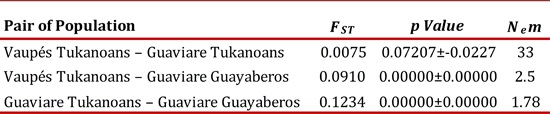 Through an analysis of molecular variance, the degree of population genetic structure in two hierarchical levels was estimated: among groups (Vaupés Tukanoans, Guaviare Tukanoans and Guaviare Guayaberos) and among individuals within groups. This analysis divides the total variance into covariance components due to the intraindividual, interindividual and/or interpopulation differences. Covariance components were used to compute fixation indices, FST. Gene flow was measured as Nem = (1/FST -1)/4. The calculations were performed with Arlequin 3.11.