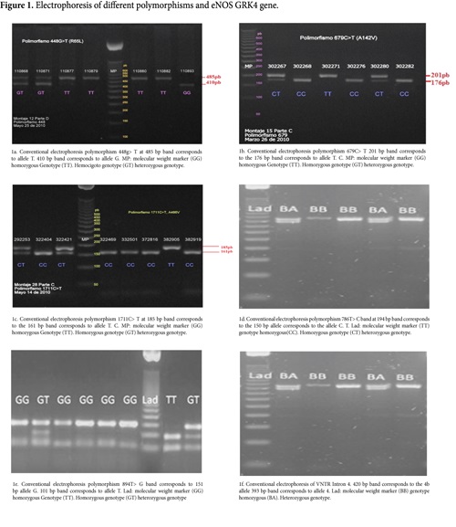 Genetic variants or polymorphisms associated with the regulation of urinary excretion of sodium and vasomotor regulation are potential risk factors for the development of hypertension. Among the former are the polymorphisms 448g>T or R65L or rs2960306, 679C>T or A142V or rs1024323 and 1711C>T or A486V or rs1801058 of the gene GRK4 that encodes the kinase 4 of receptors coupled to the G protein, specifically D1 and D2 dopamine receptors, which mediate the natriuretic effect of catecholamine in the proximal convoluted tubule of the nefron2. Among the latter are the highlighted polymorphisms of 894G>T or Glu298Asp or rs1799983, the - 786T>C or rs2070744 and Intron 4 of the gene eNOS that encodes the endothelial nitric oxide synthase3. Nitric oxide (NO) induces vasodilation and reduction of blood pressure by inhibiting the growth and contraction of the smooth muscle arterial wall4. The relationship of these polymorphisms with the risk of developing hypertension is still uncertain5.