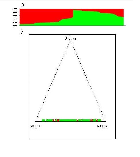 Evidence for the lack of structure was confirmed by the analysis performed with the Structure v. 2.3 software to evaluate K=2 (possible ancestors) and with 10,000 replicates assuming a mixed model21. The results showed that very few individuals who could possibly belong to another population group, they also showed the absence of genetic structure in the population sample analyzed (Figs. 2A and 2B).