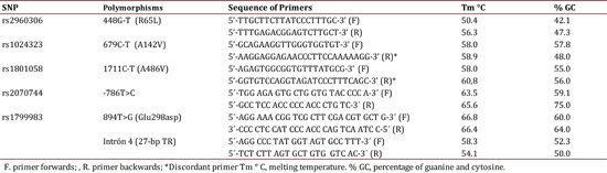 Once the PCR was standardized, six samples were selected of each polymorphism to be sequenced with the Big Dye terminator kit (Applied Biosystems®) and the sequences obtained were aligned with the Clustal W software (http://www.ebi.ac.uk selected/Tools/msa/clustalw2/) to confirm correspondence with the expected fragments.