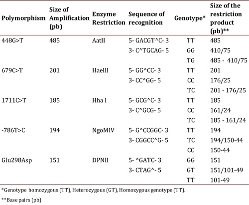 The set-up of the Glu298Asp polymorphism PCR contained 1X Buffer-GoTaq (r) - Green Master Mix 0.4 µM of each primer and 2.4 ng of DNA, for a final volume of 25 µL. The amplification protocol consisted of an initial step of 95° C for 2 min, followed by 35 cycles as follows: denaturation at 95° C for 45 seconds, annealing at 63° C for 45 seconds and extension at 72° C for 45 seconds and a final step at 72° C for 5 min. The PCR set-up for polymorphism -786T>C containing 1X Buffer, 2.5 mM MgCl2 , 0.4 µM of each primer, 0.8 µM dNTPs, 1 U of enzyme Taq DNA polymerase (promega®) and 2.4 ng of DNA in a final volume of 25 µL. The amplification protocol included an initial step of 94° C for 4 min, followed by 35 cycles as follows: denaturation at 94° C for 30 seconds, annealing at 63° C for 30 seconds and extension at 72° C for 1 min and a final step at 72° C for 5 min. The amplification of these polymorphisms was verified by electrophoresis in a 1% agarose gel. The PCR products were subjected to enzyme restriction using the following protocol: 1X buffer, 0.1 µg/µL of acetylated BSA, 1 U of the corresponding restriction enzyme (Table 2) and 0.5 ng of DNA in a final volume of 15 µL; the reaction was conducted for incubation during 14 hours at 37° C.