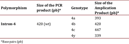 The set-up of the PCR for intron 4 was performed using the same protocol as the polymorphism-786T>C. The sizes of the fragments of this polymorphism, amplification products were visualized by means of electrophoresis in a 3% agarose gel with a tension of 60 volts for 80 min. In Table 3 displays the size of the amplification products of this intron17. The analyses of all samples were performed in a blind manner to avoid bias and 10% of the samples were processed in duplicate with no discrepancy being evident.
