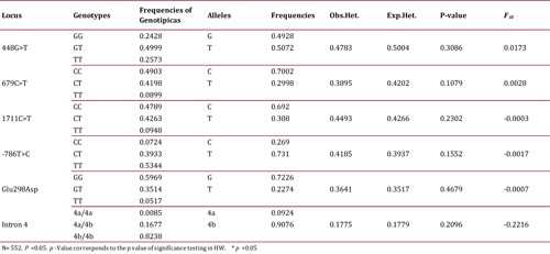 All studied polymorphisms were found in the Hardy-Weinberg Equilibrium indicating that the population is composed of individuals that are mixed randomly. This finding agrees with that reported in previous studies on a Bucaramangan population for the gene eNOS15 and in an Hispanic population of Southern California for the gene GRK423 where no data are reported for the Colombian population.